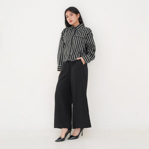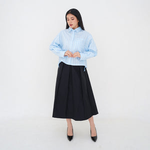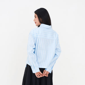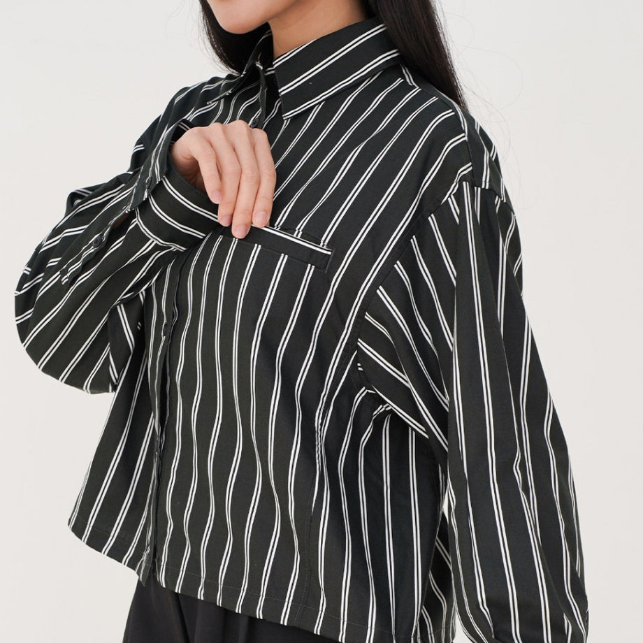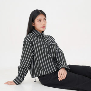 Kemeja crop motif striper (vertikal/arah memanjang ke bawah) dengan detail drop shoulder, saku vest dibagian kiri, lengan panjang dan tali karet serut yang bisa di adjust