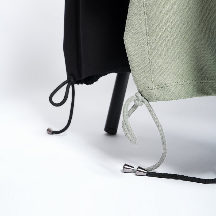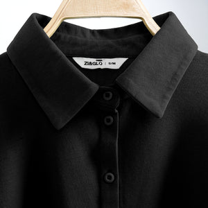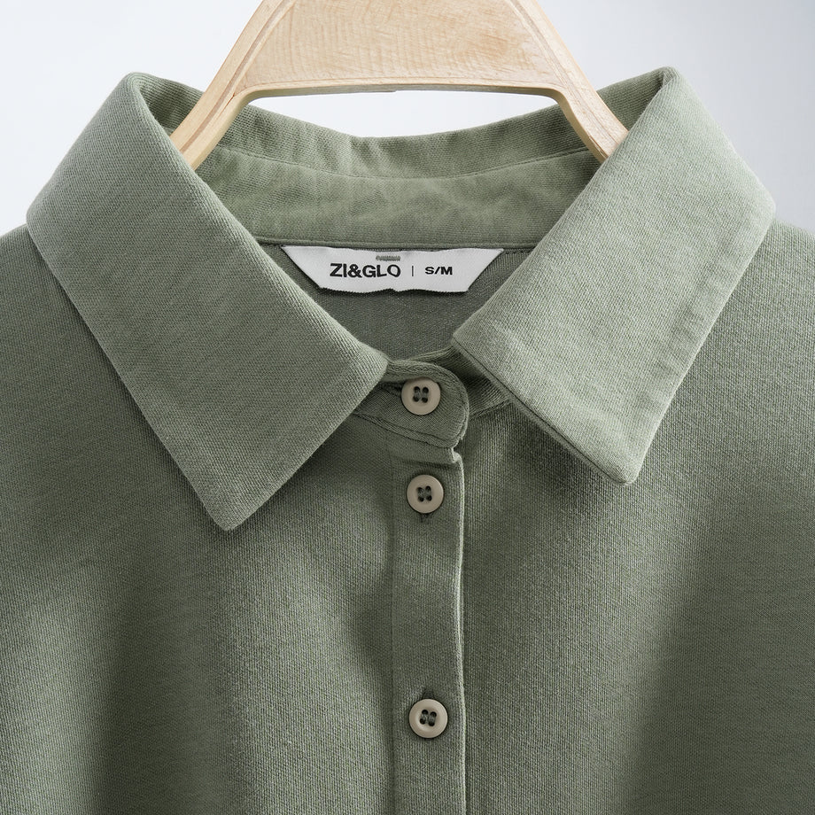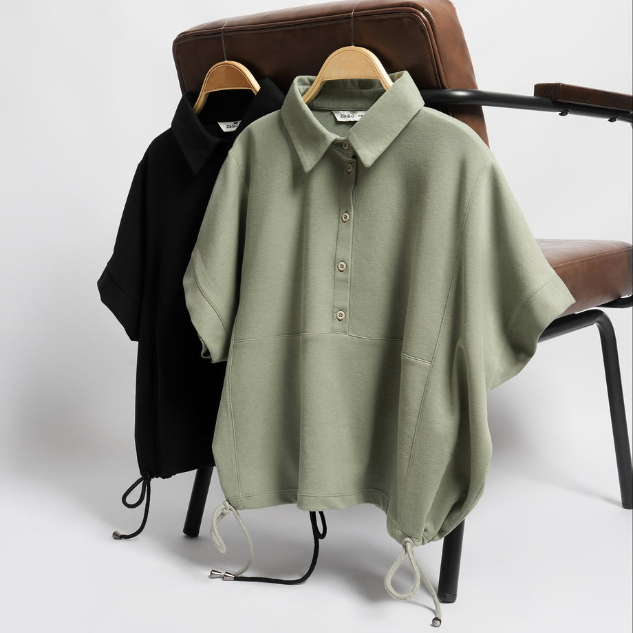 Atasan berkerah dengan detail bukaan kancing depan divariasikan dengan empire line dan tali serut katun berstoper bahan alloy.