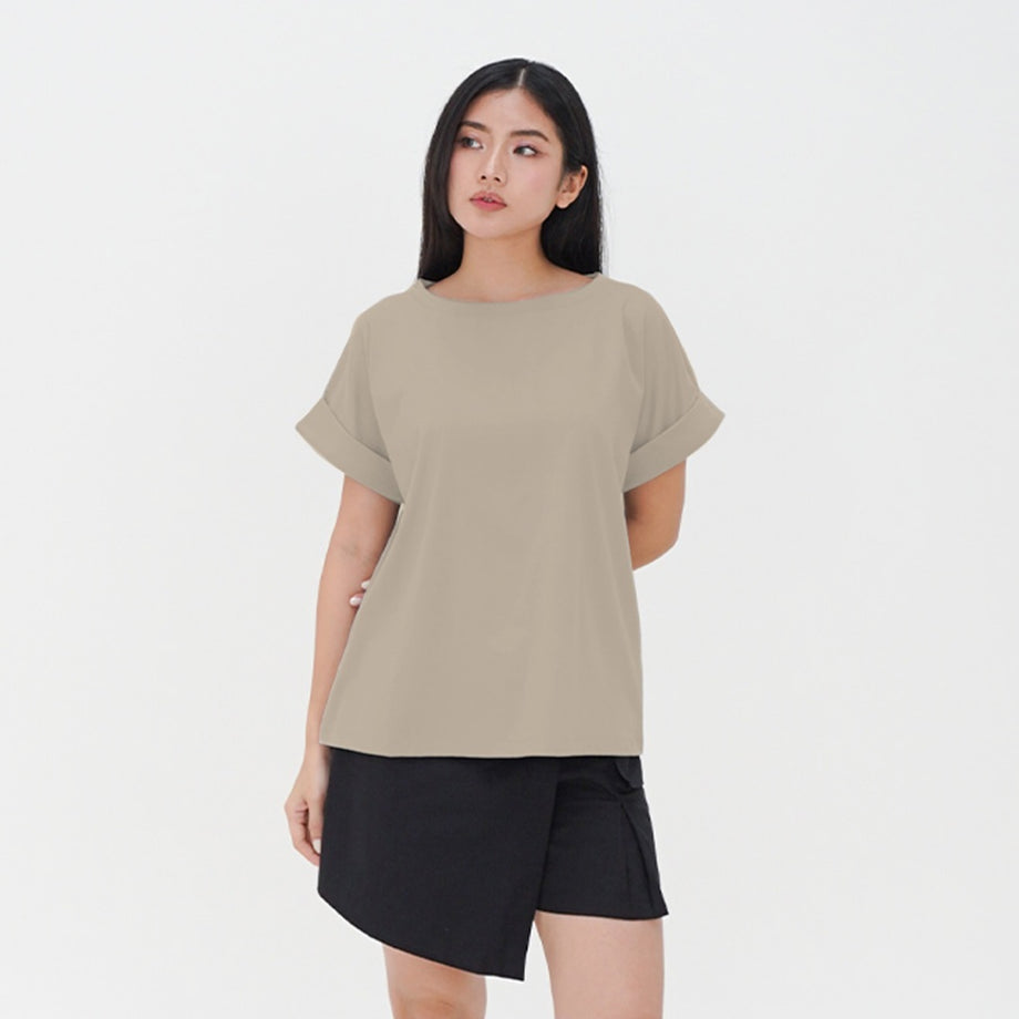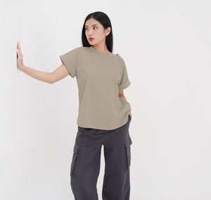 T-shirt dengan lengan rolled up (digulung), cuttingan relaxed fit, boat neckline dan magyar sleeve.