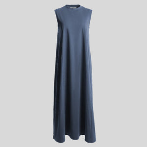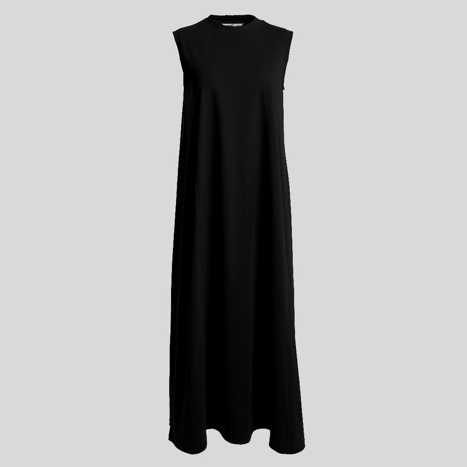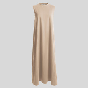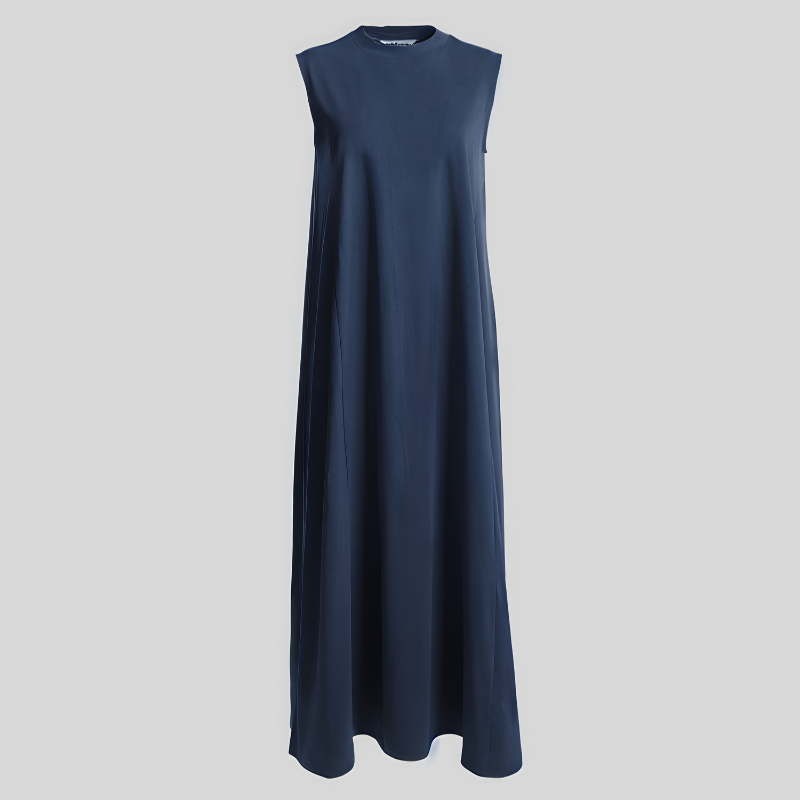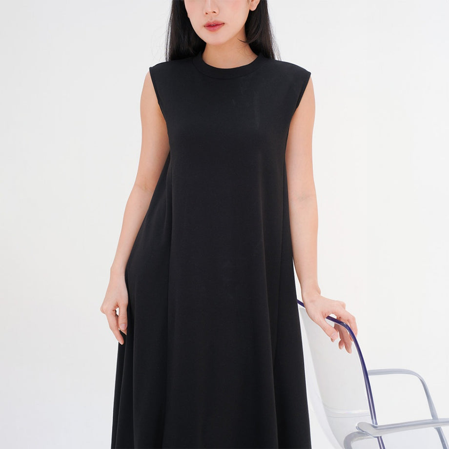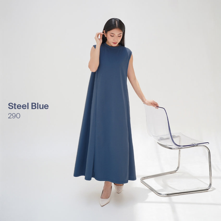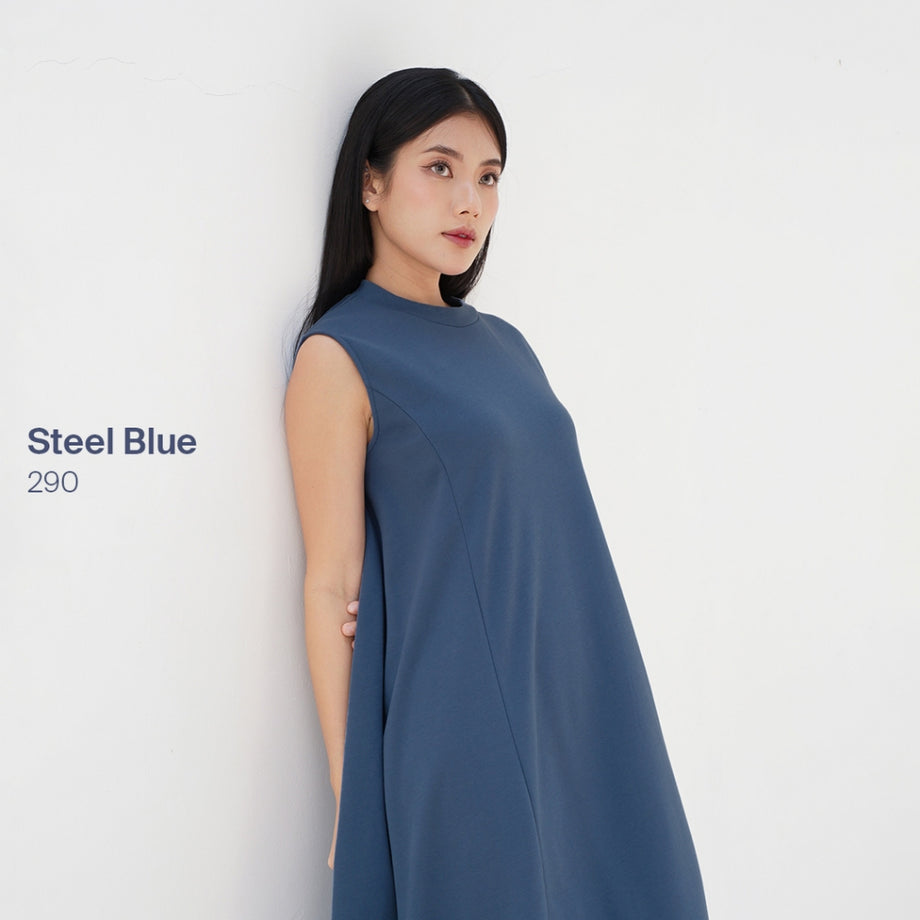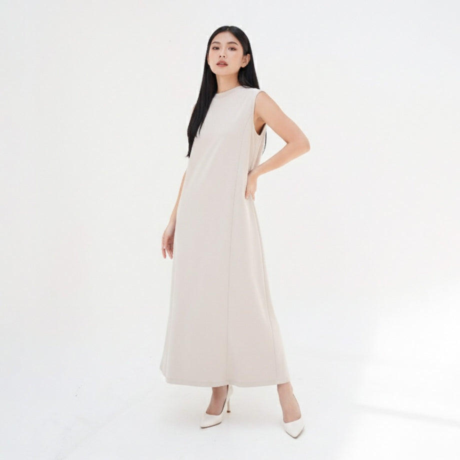 Dress tanpa lengan dengan kerah tinggi, detail garis princess dibagian depan dan belakang, dan bersiluet A.